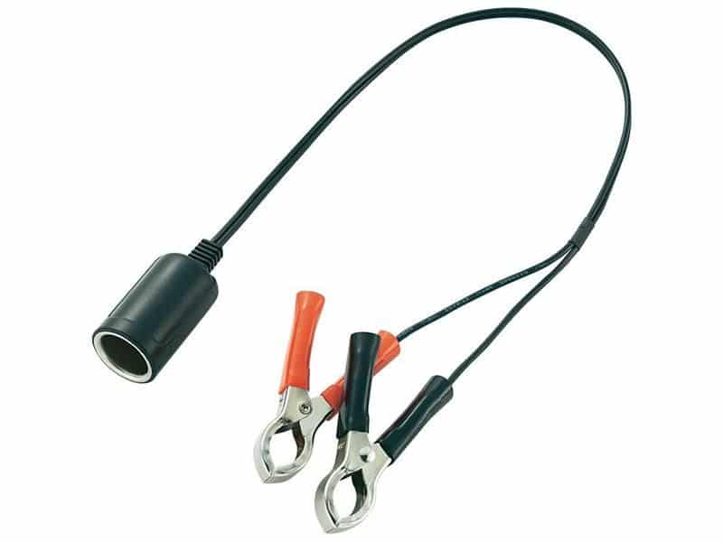 Kabelový adaptér se svorkami na baterii a samicí autozásuvky umožňuje přímé napájení 12 V spotřebičů z autobaterie. Disponuje délkou 45 cm, maximálním proudem 10 A a je vhodný pro standardní autozásuvku.
