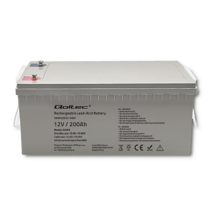 Bezúdržbová baterie/akumulátor Qoltec AGM Olověná kyselina 12V 200Ah je vyrobena z kvalitních materiálů, založená na technologii AGM t.j. konstrukce obsahující separátor ze skleněné vaty, který absorbuje elektrolyt.