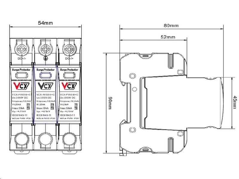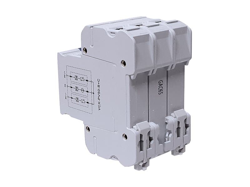 Přepěťová ochrana DC je vybavena varistory (MOV) v modulech DC+ a DC- a plynovým iskřičem (GDT) v modulu PE, což účinně eliminuje problém stárnutí iskřiče vlivem tzv. svodového proudu a provozního proudu. Přepěťová ochrana pro fotovoltaiku VCX je vybavena vizuálním indikátorem provozu (zelená - ochrana, červená - bez ochrany).