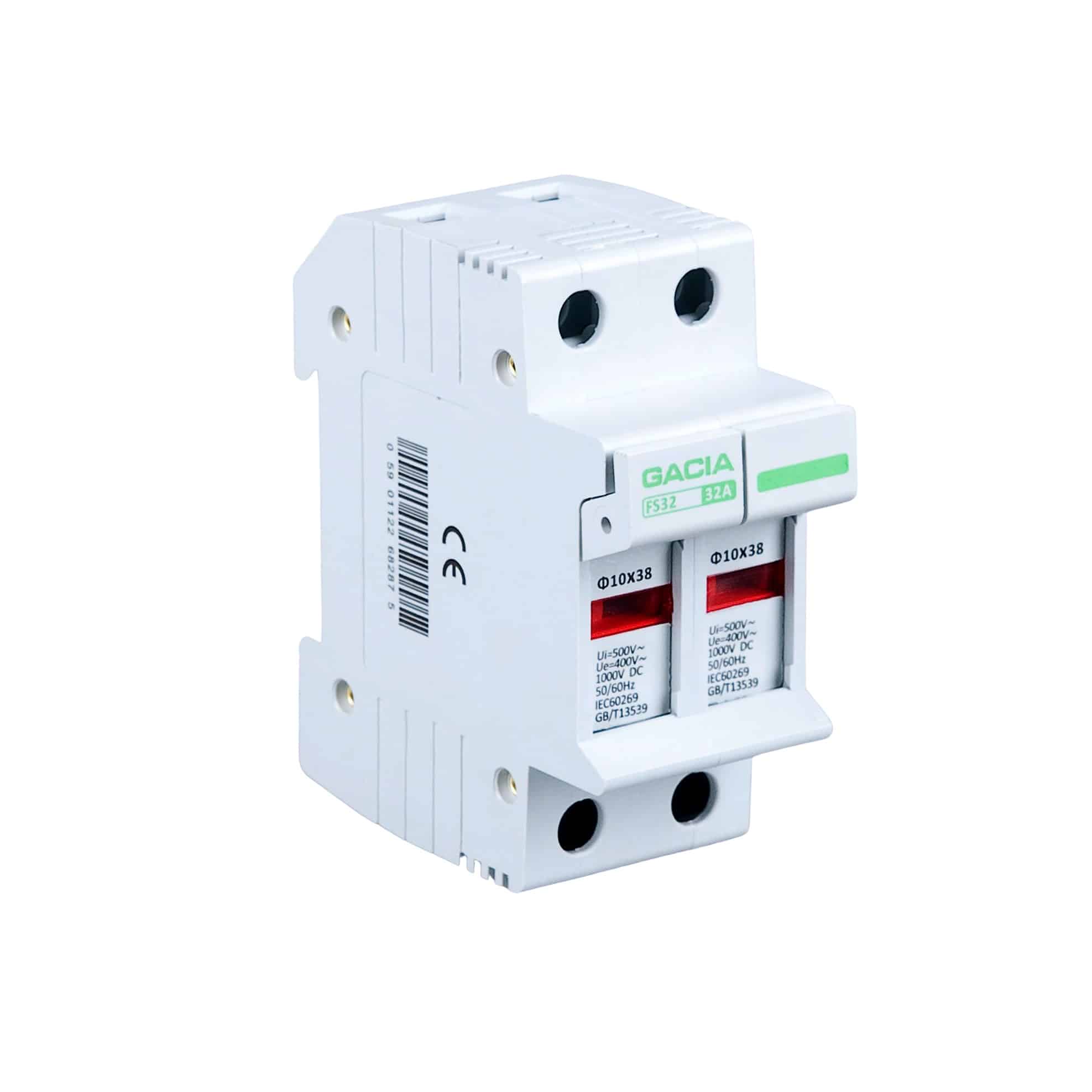 DC pojistkový odpojovač FS-32 PV 2P, 1-32A 1000VDC na DIN lištu pro fotovoltaické systémy. Gacia PRO pojistkový odpojovač.