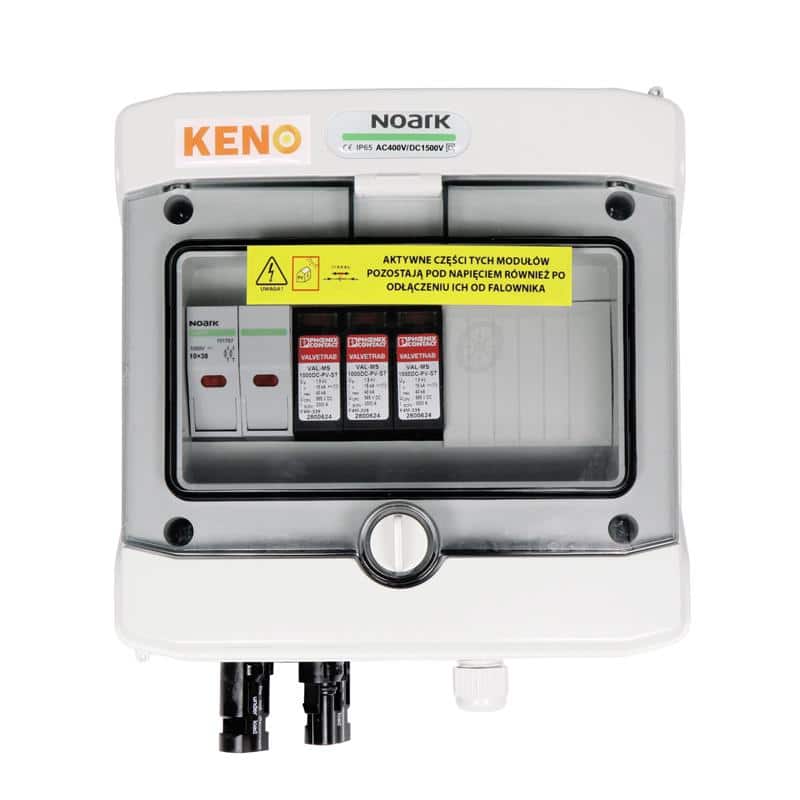 Rozvodná skříň od polského výrobce KENO pro fotovoltaiku je vybavena ochranou proti účinkům nepřímých výbojů na straně stejnosměrného proudu. Je určena k použití v uzemněných a izolovaných fotovoltaických instalacích. Díky vysokému stupni ochrany IP je možná instalace ve venkovním prostředí. Rozváděč je určen pro povrchovou montáž pro fotovoltaiku. V závislosti na zařízení může rozváděč plnit různé funkce.