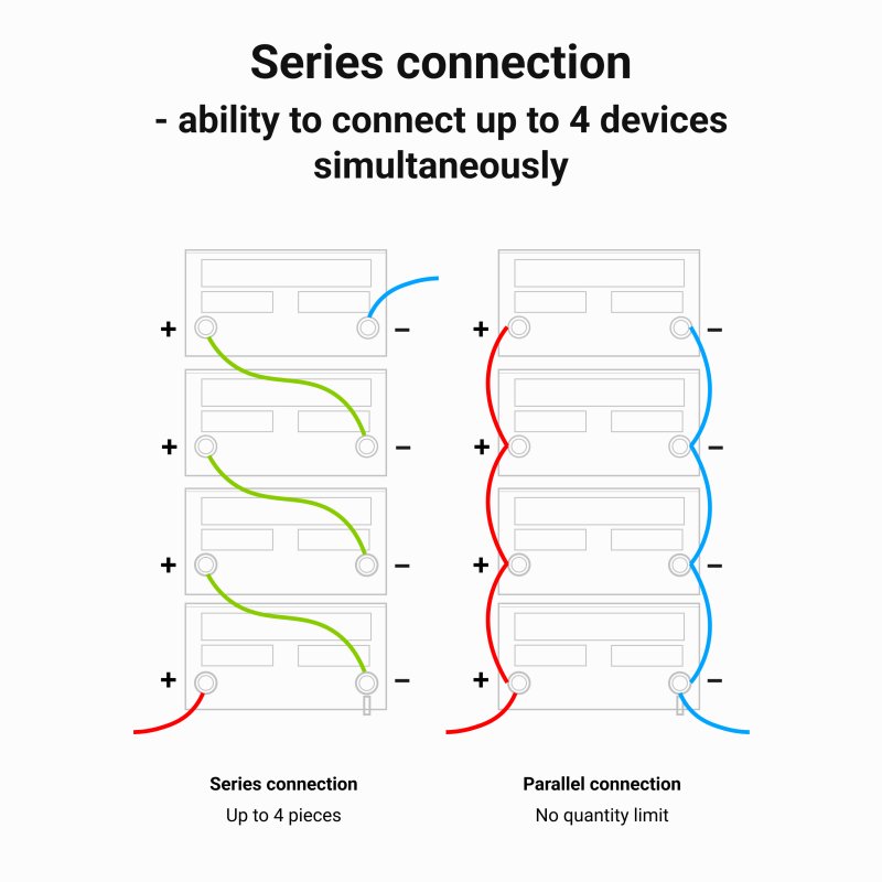 Při instalaci máte flexibilní možnosti zapojení. Do série je možné zapojit maximálně 4 kusy, což umožní navýšit systémové napětí podle potřeby. Výrobce zároveň doporučuje paralelní zapojení s neomezeným počtem baterií, abyste jednoduše rozšířili kapacitu systému.