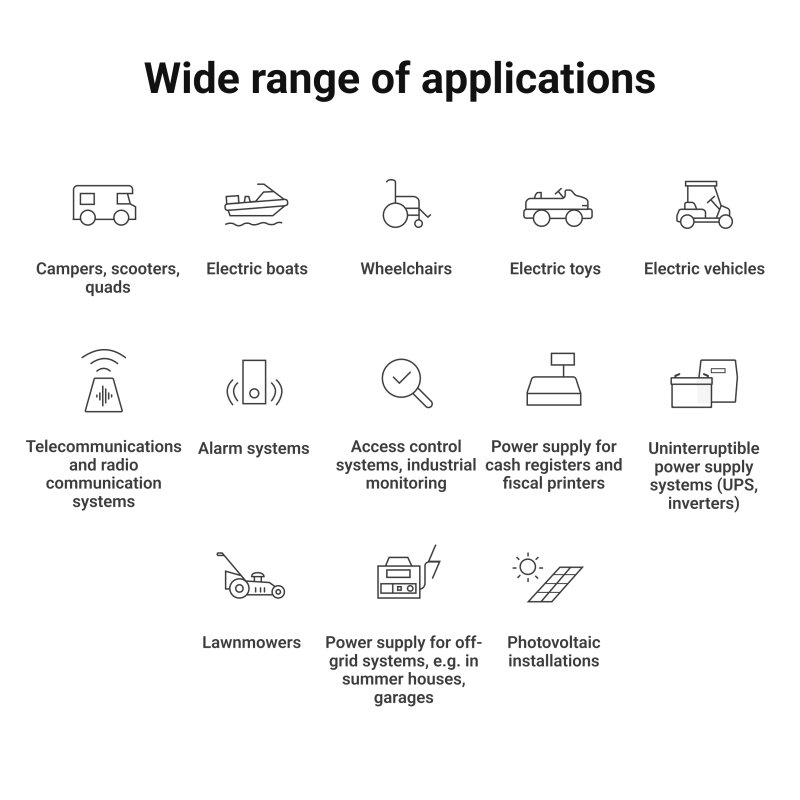 Vysoká odolnost, dlouhá životnost, nízká hmotnost a příznivé nabíjecí parametry jsou důvody, proč se tyto baterie výborně osvědčují v karavanech, obytných autech, na člunech a v solárních (fotovoltaických) systémech. V praxi tak získáte spolehlivý zdroj energie i v náročných podmínkách, bez zbytečné údržby.