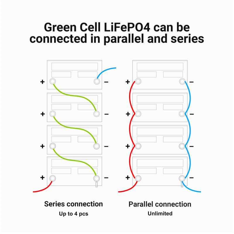 Při instalaci máte flexibilní možnosti zapojení. Do série je možné zapojit maximálně 4 kusy, což umožní navýšit systémové napětí podle potřeby. Výrobce zároveň doporučuje paralelní zapojení s neomezeným počtem baterií, abyste jednoduše rozšířili kapacitu systému.