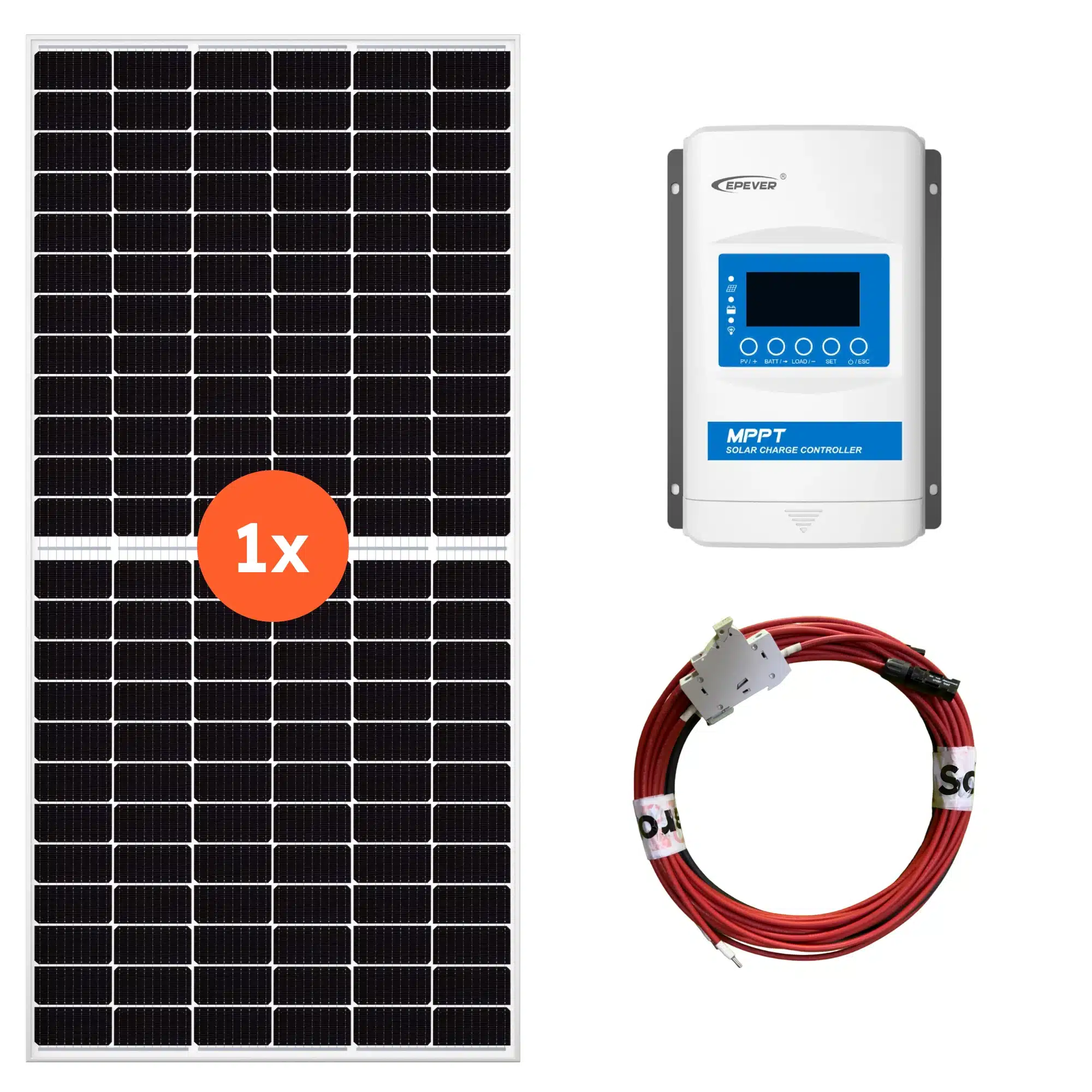 - 10m prodlužovací kabely 4mm² (černý a červený) s pojistkovým vypínačem a konektory MC4