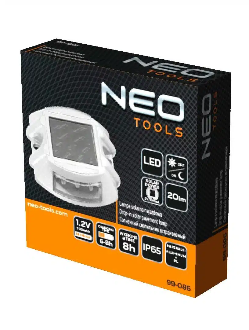 • LED solární nájezdové svítidlo NEO 99-086 20 lm odolá tlaku až 30 tun a je určeno k použití v zemi nebo jiných typech povrchů.