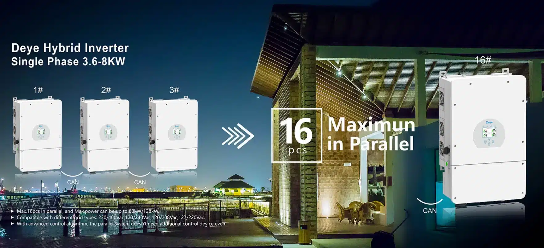 Solární hybridní měnič s výkonem 8 000 W je určen pro různorodé aplikace, umožňuje vzdálenou správu přes cloud, disponuje asymetrickým 3-fázovým výstupem, je vybaven CANbus rozhraním pro baterie s napětím od 40 do 60 V, obsahuje také porty RS232, RS485 a DRM pro zvýšenou flexibilitu a je vybaven dvěma MPPT s účinností 99,9 %.