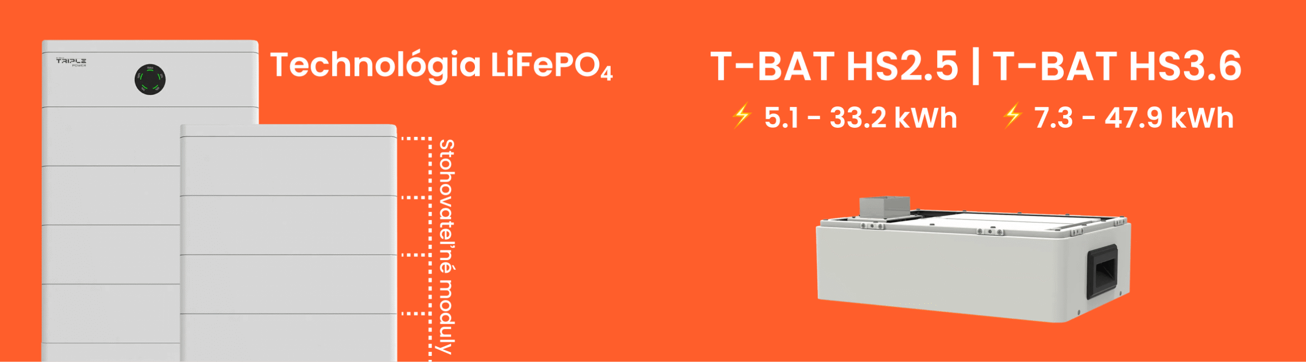 Stohovatelné moduly T-BAT-SYS-HV-S2.5 nabízejí vysokou bezpečnost díky technologii LiFePO₄, dosahují nabíjecího a vybíjecího proudu až 45 A a disponují ochranou IP65. K zapojení první bateriové věže je potřebná řídící jednotka Triple MCS0800, pro propojení druhé věže se systémem slouží T-BAT-SYS-HV Series Box.