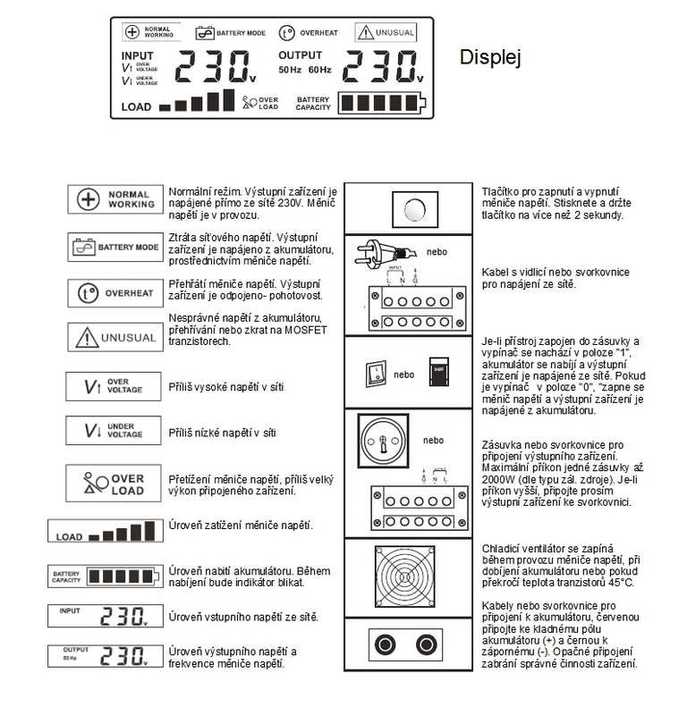- Ochrana: proti přetížení, přepětí, výstupního napětí 230V, napětí akumulátoru, před přebíjením, proti zkratu, před zvýšenou teplotou