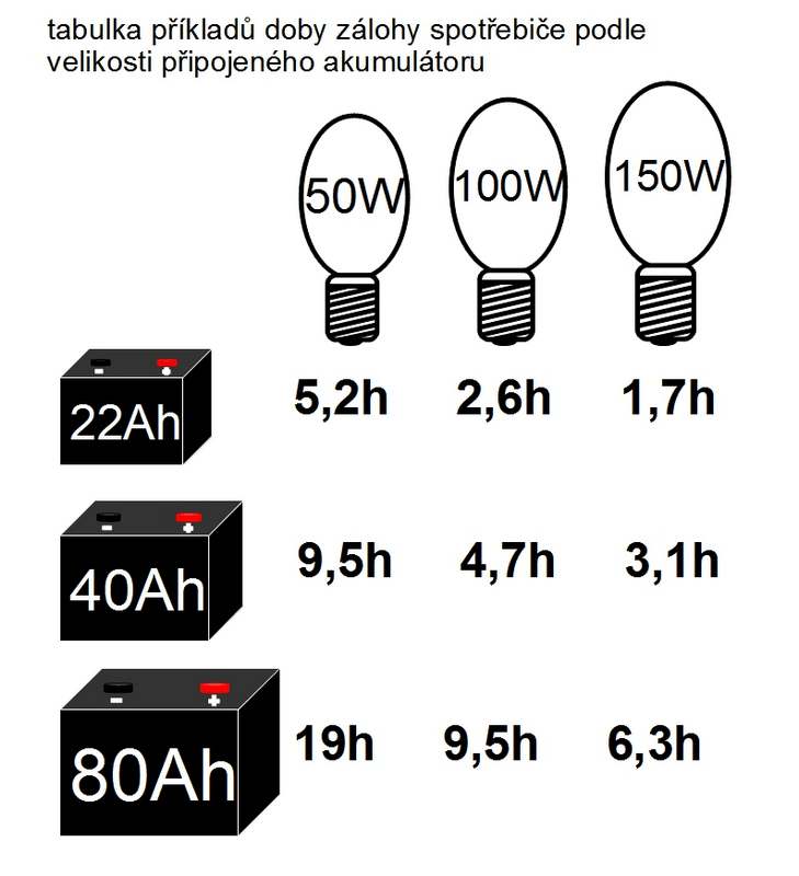Pamatujte na to, že spotřebič s indukční zátěží (motory, spínané zdroje, výbojky ...) vyžadují při startu na krátkou dobu více proudu (2x - 8x) než klasická odporová zátěž stejného příkonu (např. žárovka...). Tento záložní zdroj je přizpůsoben i pro tyto spotřebiče, zdroj je možné krátkodobě zatížit o 20% více, než je udávaná maximální zátěž.