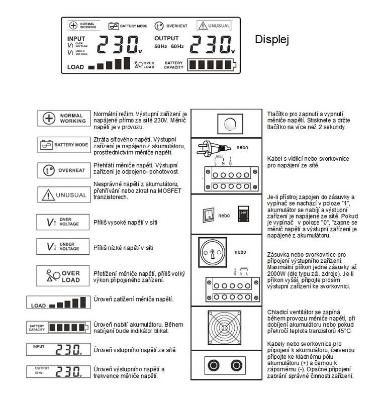 • Ochrana: proti přetížení, přepětí, výstupnímu napětí 230V, napětí akumulátoru, před přebíjením, proti zkratu, před zvýšenou teplotou