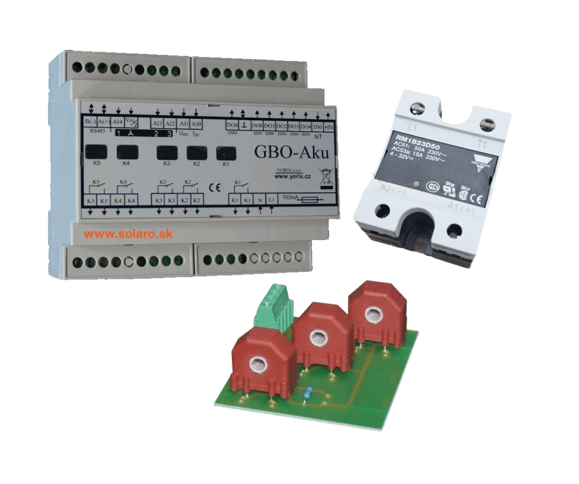 Sestava GBU-AKU regulátor přebytků pro trojfázové on-grid fotovoltaické elektrárny.